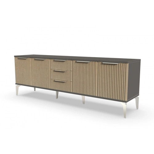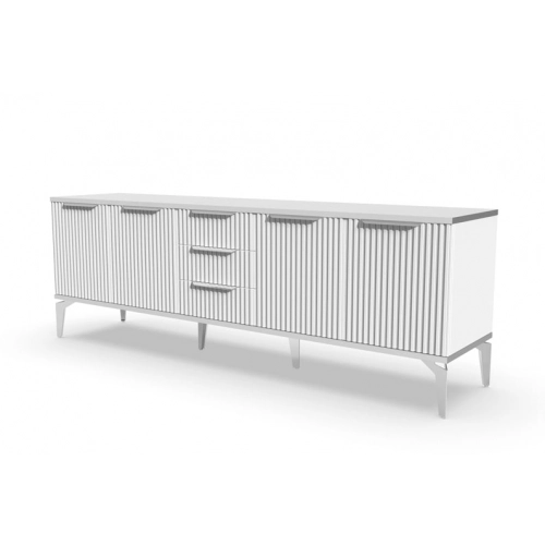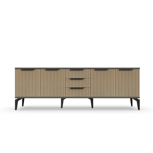 Тумба под телевизор "Рейн" является идеальным дополнением к любому современному интерьеру. Она имеет практичный дизайн, который позволяет хранить различные предметы и украшения, при этом оставаясь удобной и функциональной. Рифлёные поверхности придают тумбе уникальный и стильный вид, который будет выглядеть превосходно в вашей гостиной или гостевой комнате.
